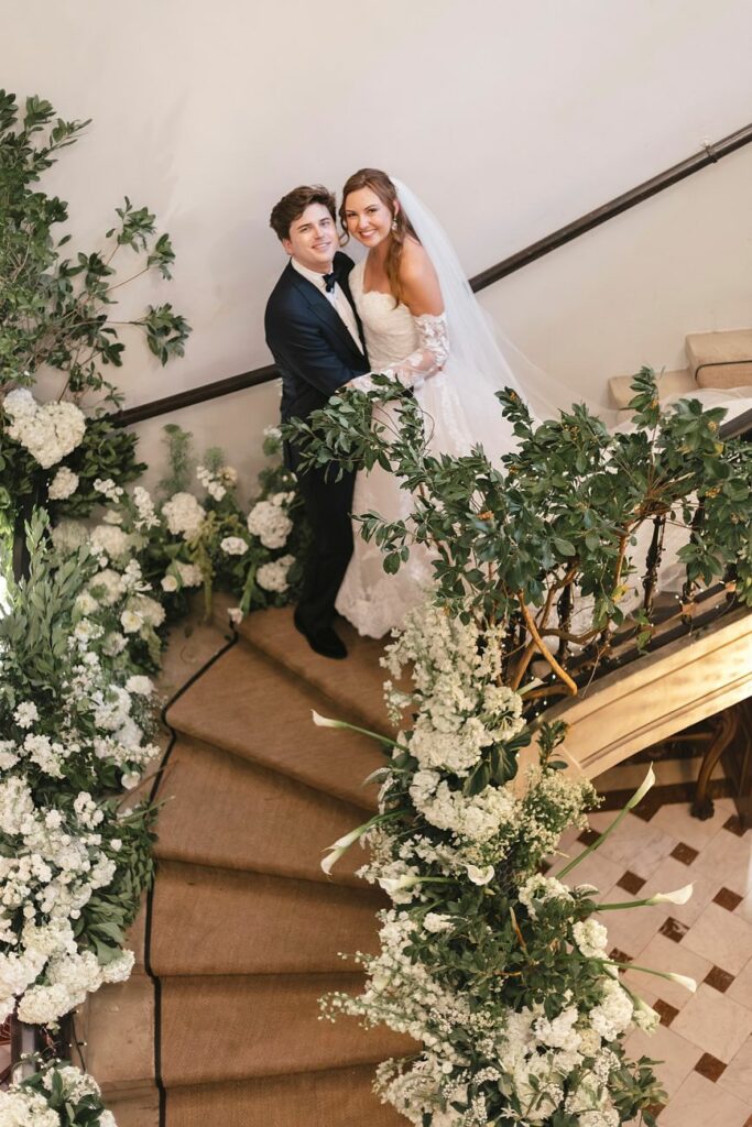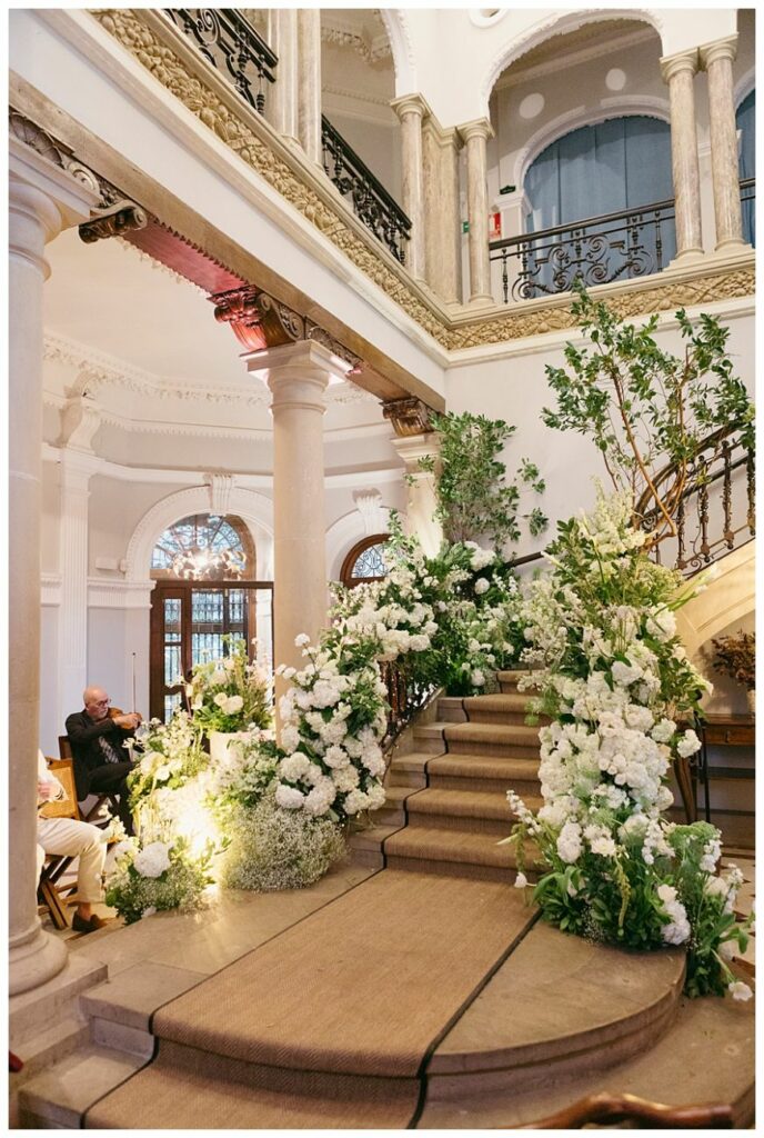 The wedding ceremony took place inside Palacio San Joseren, using the palace’s iconic staircase as the central focal point. Lined with lush white florals and soft greenery, the staircase was transformed into a breathtaking altar that felt both intimate and grand.