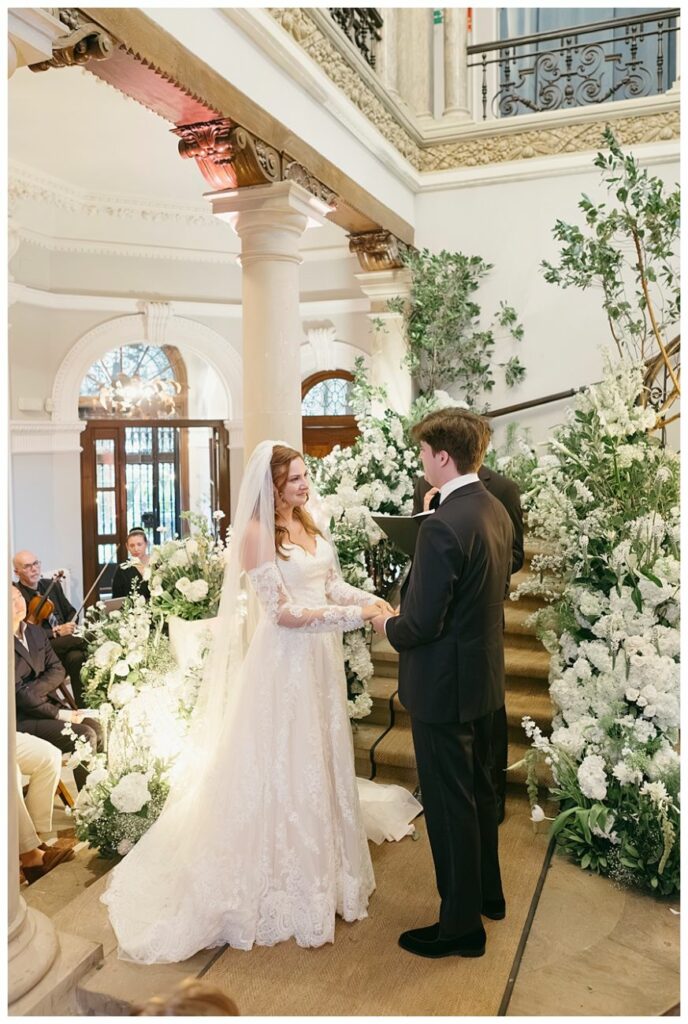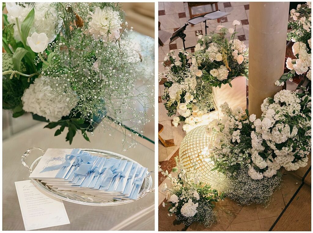 Hosting the ceremony indoors highlighted the architectural beauty of the palace, creating a timeless and elegant setting. The floral design enhanced the space without overpowering it, allowing the natural proportions and details of the building to shine.